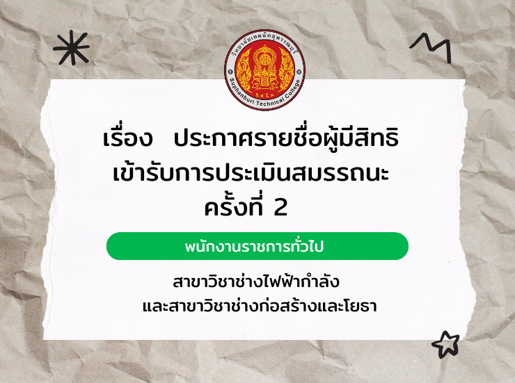 ประกาศรายชื่อผู้มีสิทธิเข้ารับการประเมินสมรรถนะ ครั้งที่ 2 เพื่อเลือกสรรและจัดจ้างเป็นพนักงานราชการทั่วไป กลุ่มงาน บริหารงานทั่วไป ตำแหน่ง พนักงานบริหารทั่วไป (ครู) สาขาวิชาช่างไฟฟ้ากำลัง และสาขาวิชาช่างก่อสร้างและโยธา ... read more