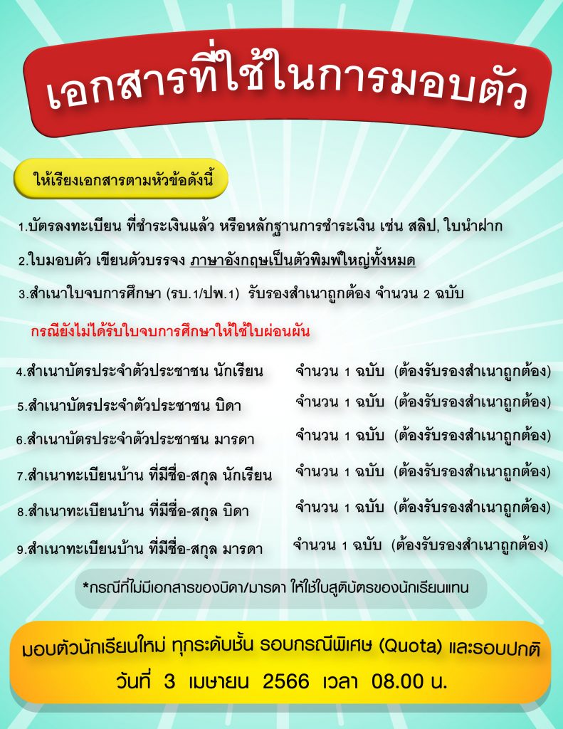 Download ใบมอบตัว ใบมอบตัวเขียนตัวบรรจง ให้ถูกต้องครบถ้วน ภาษาอังกฤษเป็นตัวพิมพ์ใหญ่ทั้งหมด Download ใบผ่อนผันวุฒิการศึกษา ใบผ่อนผันใช้ในกรณีที่ยังไม่ได้วุฒิการศึกษา ในวันที่มอบตัว