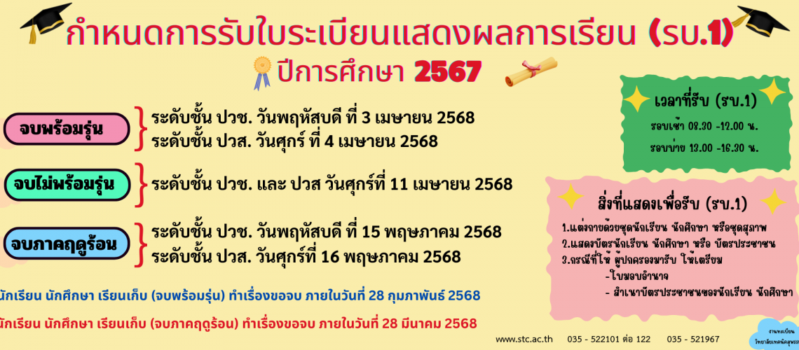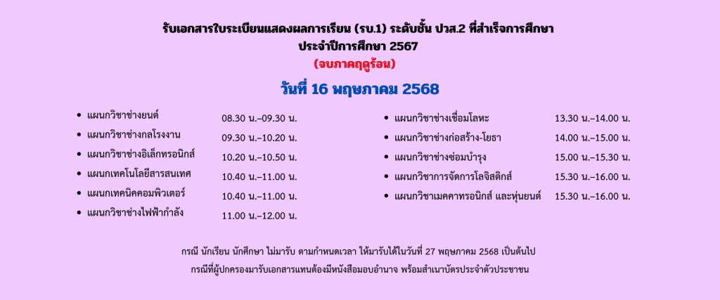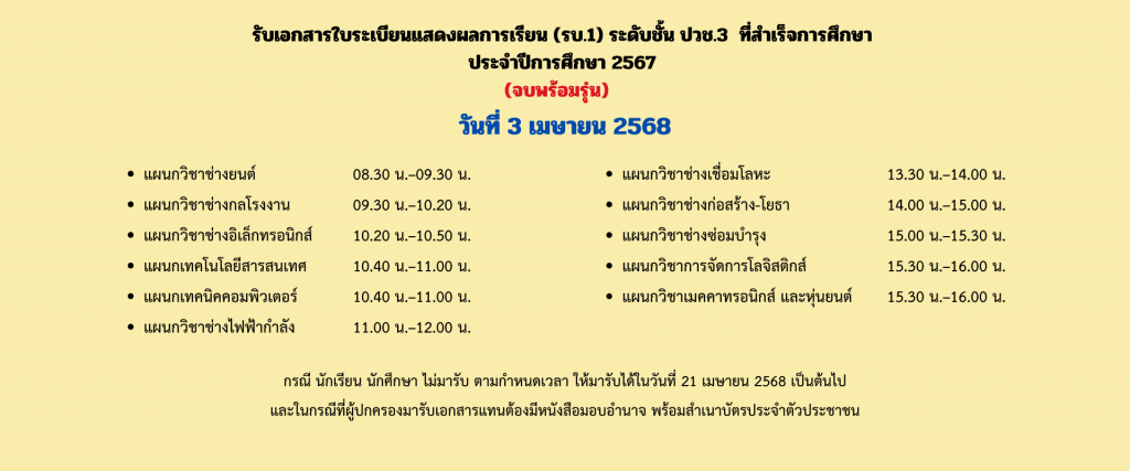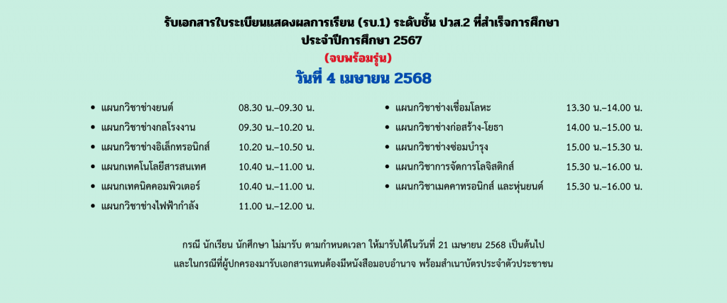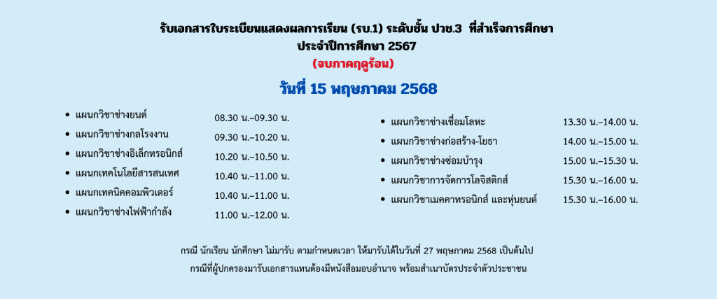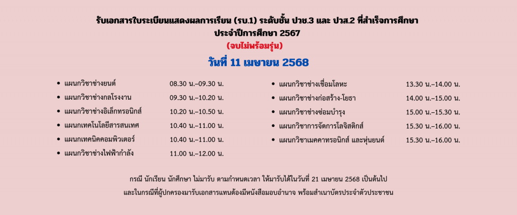 กำหนดการรับเอกสารใบระเบียนแสดงผลการเรียน (รบ.1) ระดับชั้น ปวช.3 และ ปวส.2 ที่สำเร็จการศึกษา ปีการศึกษา 2567