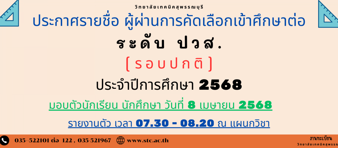 ประกาศรายชื่อ ผู้ผ่านการสอบคัดเลือกเข้าศึกษาต่อ ระดับ ปวส. รอบปกติ ประจำปีการศึกษา 2568