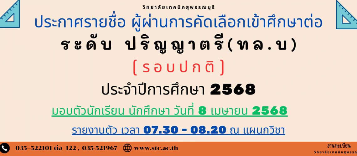 ประกาศรายชื่อ ผู้ผ่านการสอบคัดเลือกเข้าศึกษาต่อ ระดับปริญญาตรี (ทล.บ.) รอบปกติ ประจำปีการศึกษา 2568