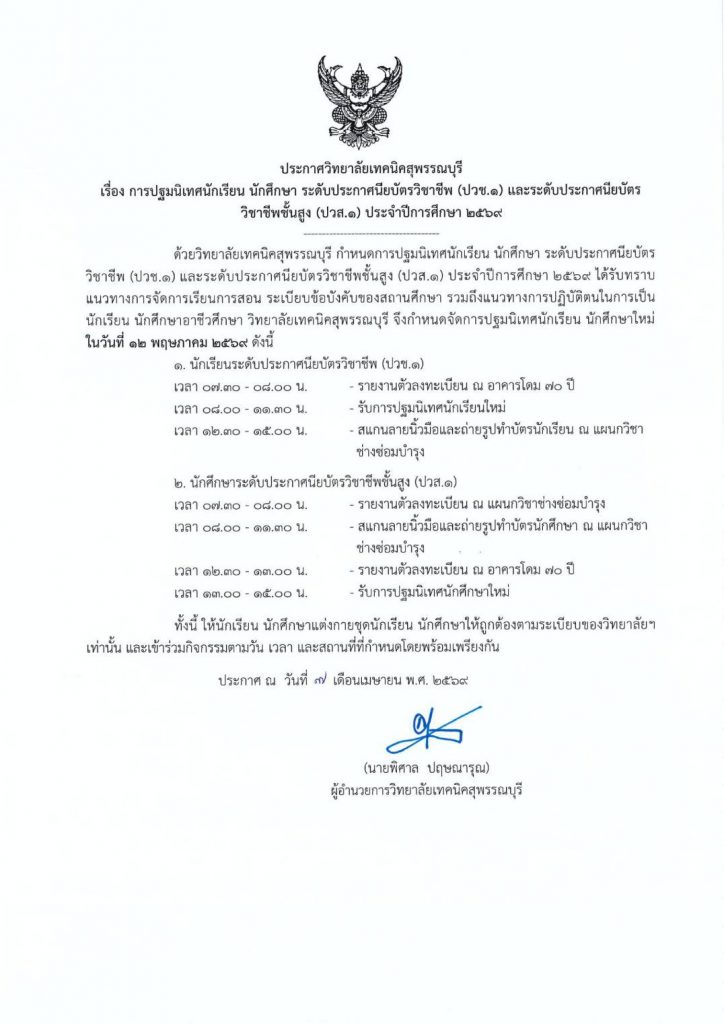กำหนดการปฐมนิเทศนักศึกษาใหม่ ปีการศึกษา 2569