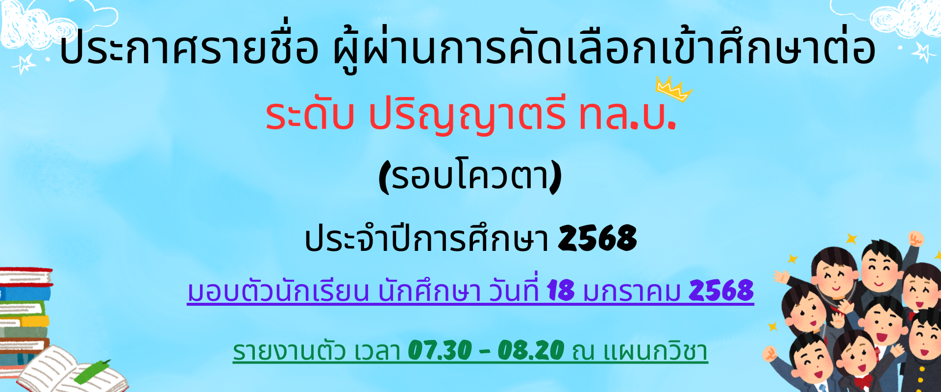ประกาศรายชื่อผู้ผ่านการคัดเลือกเข้าศึกษาต่อ (รอบโควตา) ระดับ ปริญญาตรี ทล.บ. ประจำปีการศึกษา 2568 ... read more