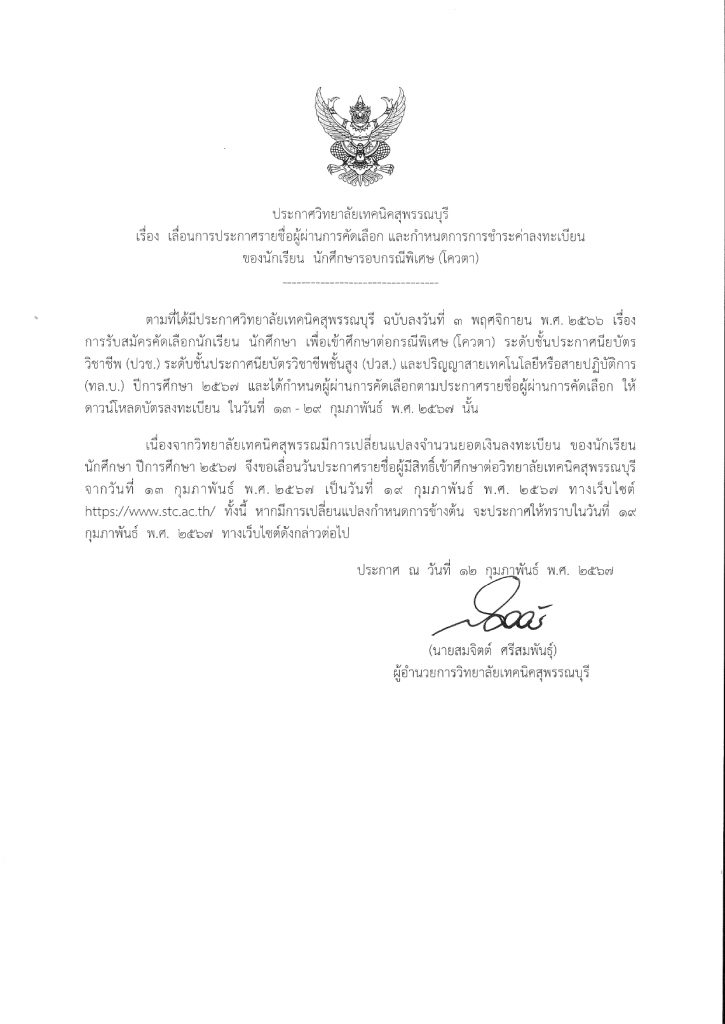 ประกาศวิทยาลัยเทคนิคสุพรรณบุรี เรื่อง เลื่อนการประกาศรายชื่อผู้ผ่านการคัดเลือก