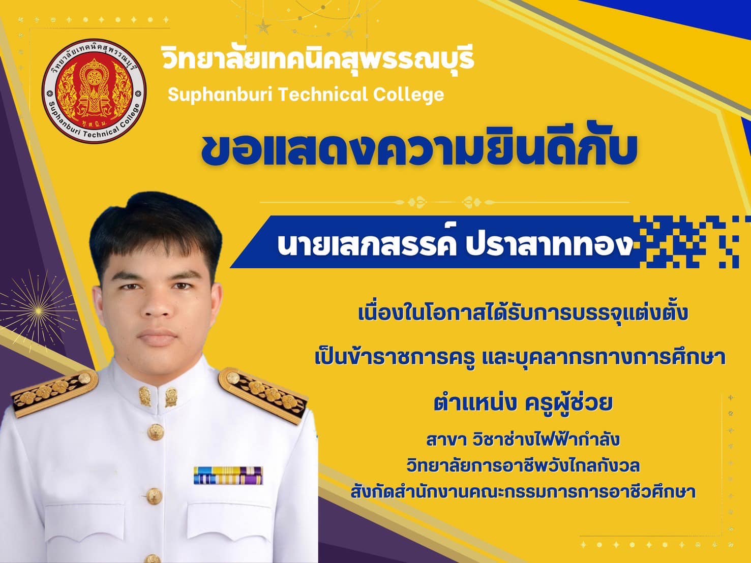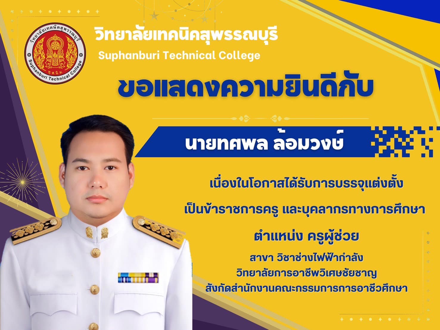 ขอแสดงความยินดีกับคุณครูทั้ง4ท่าน ของวิทยาลัยเทคนิคสุพรรณบุรี ที่ได้รับการบรรจุแต่งตั้งเป็นข้าราชการครูและบุคลากรทางการศึกษา ตำแหน่งครูผู้ช่วย สังกัดสำนักงานคณะกรรมการการอาชีวศึกษา