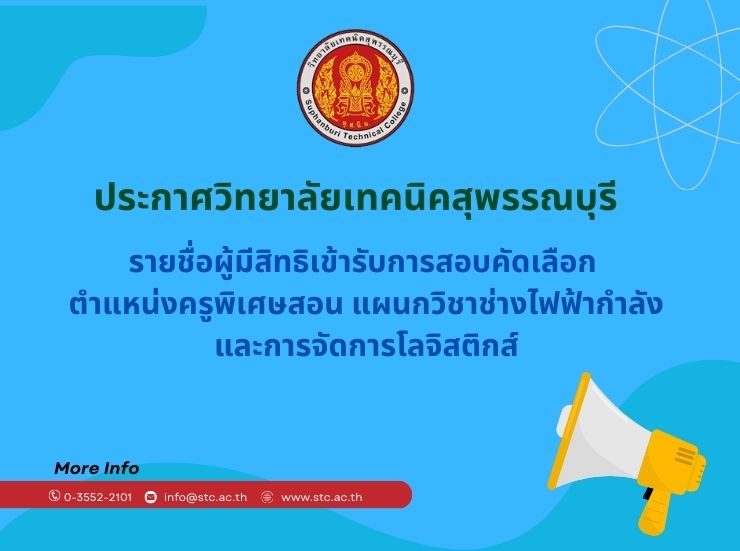 รายชื่อผู้มีสิทธิเข้ารับการสอบคัดเลือก กำหนดวัน เวลา สถานที่ในการสอบคัดเลือก ตำแหน่งครูพิเศษสอน แผนกวิชาช่างไฟฟ้ากำลัง และการจัดการโลจิสติกส์