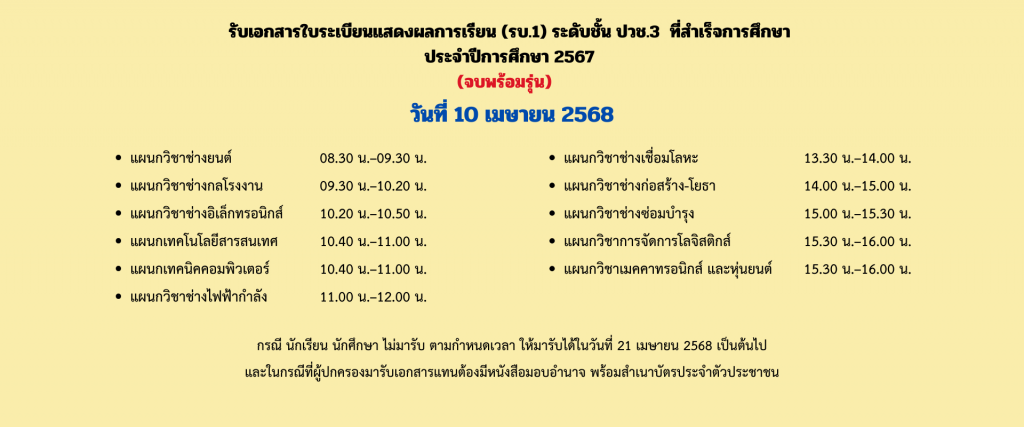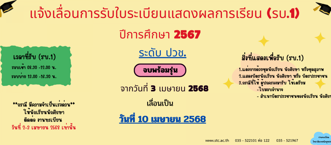 แจ้งเลื่อนกำหนดการรับใบระเบียนแสดงผลการเรียน (รบ.1) ปีการศึกษา 2567 (ระดับ ปวช.)