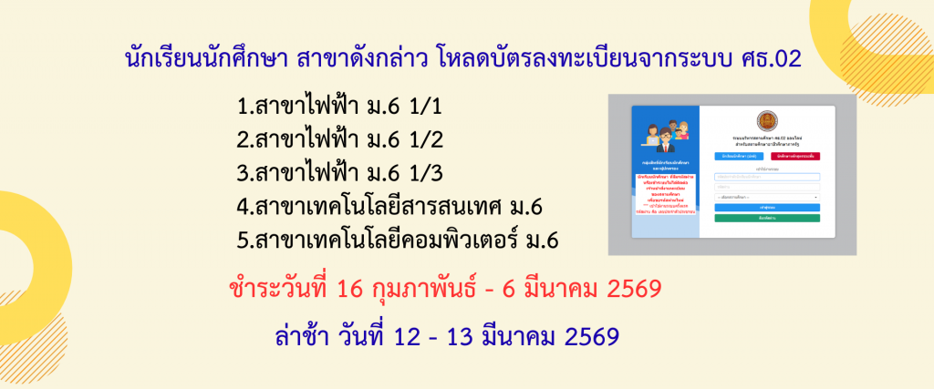 กำหนดการลงทะเบียนภาคฤดูร้อน (ตามแผนการเรียน) S/2568 ปวส.1 พื้นฐาน ม.6