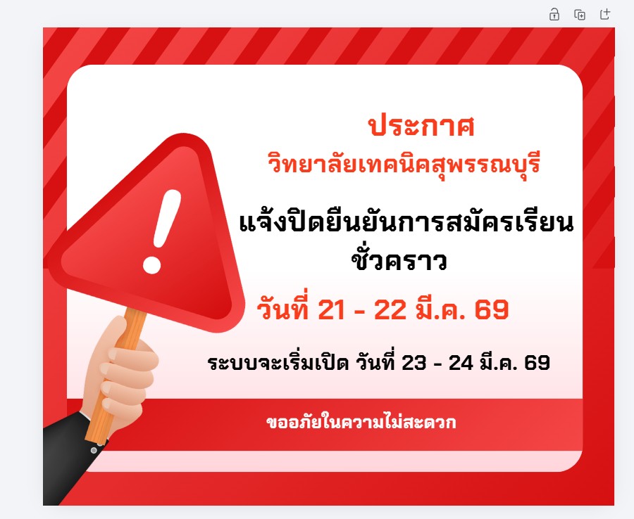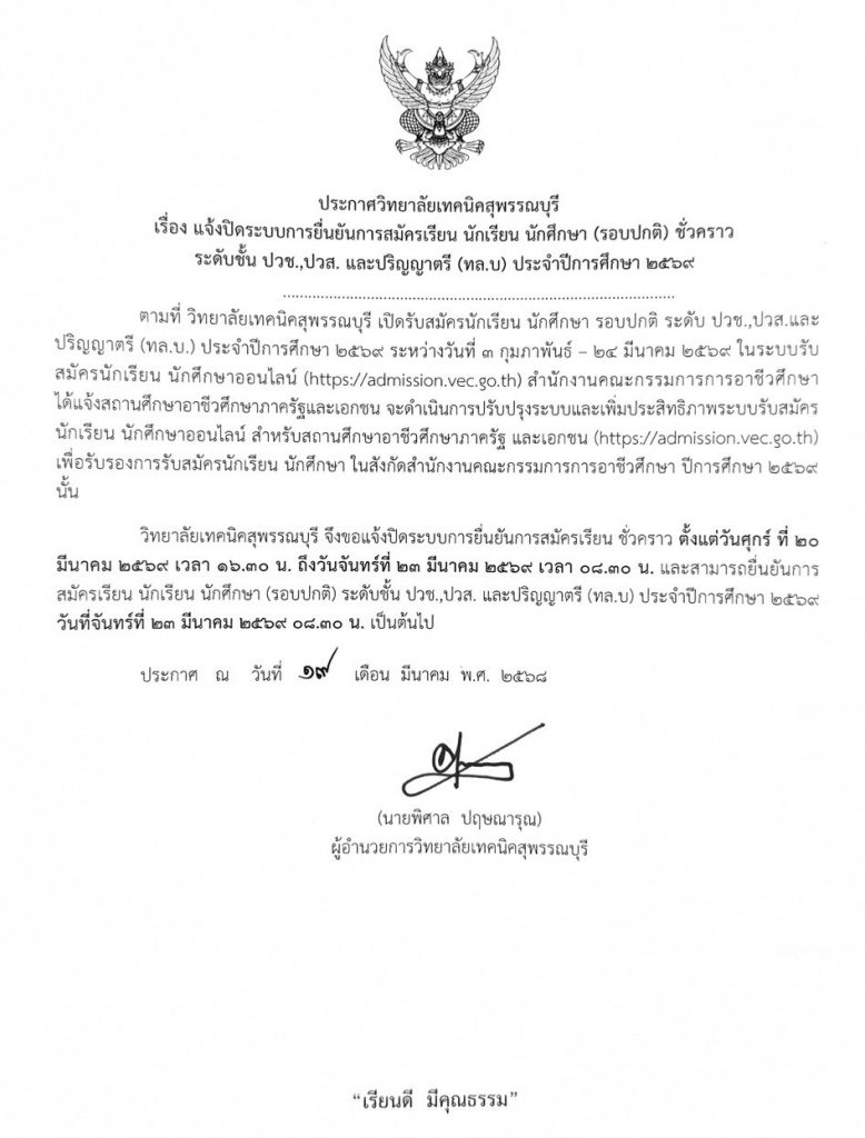 ประกาศวิทยาลัยเทคนิคสุพรรณบุรี แจ้งปิดระบบการยืนยันการสมัครเรียน นักเรียน นักศึกษา (รอบปกติ) ชั่วคราว